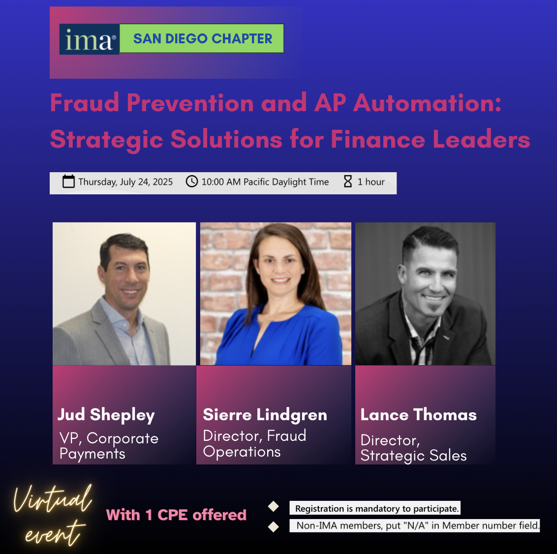 Please join us for the IMA San Diego Chapter: Fraud Prevention and AP Automation: Strategic Solutions for Finance Leaders on July 24, 2025 at 10:00 AM PDT